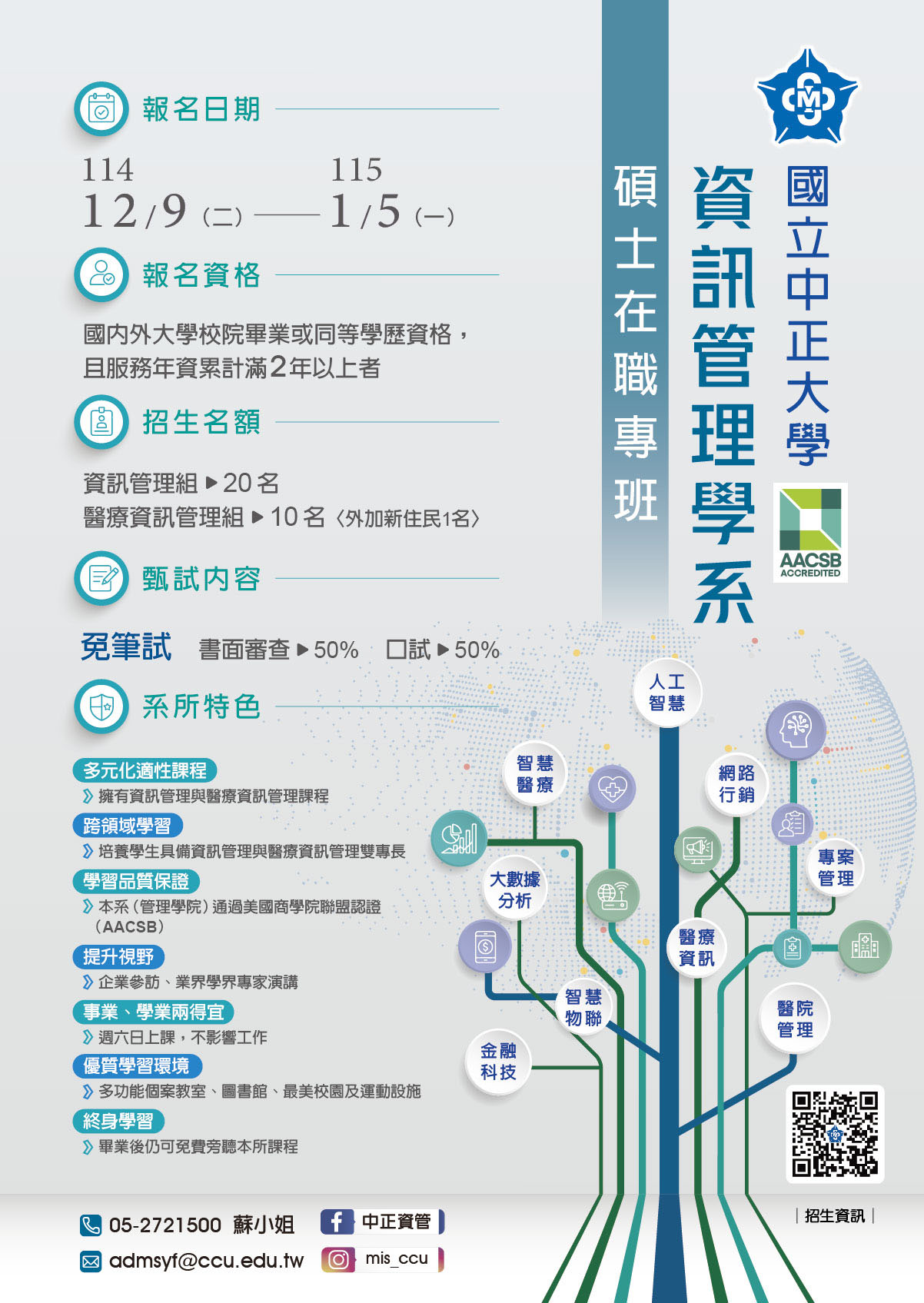 檢送國立中正大學「資訊管理學系碩士在職專班」115學年度招生資訊與海報