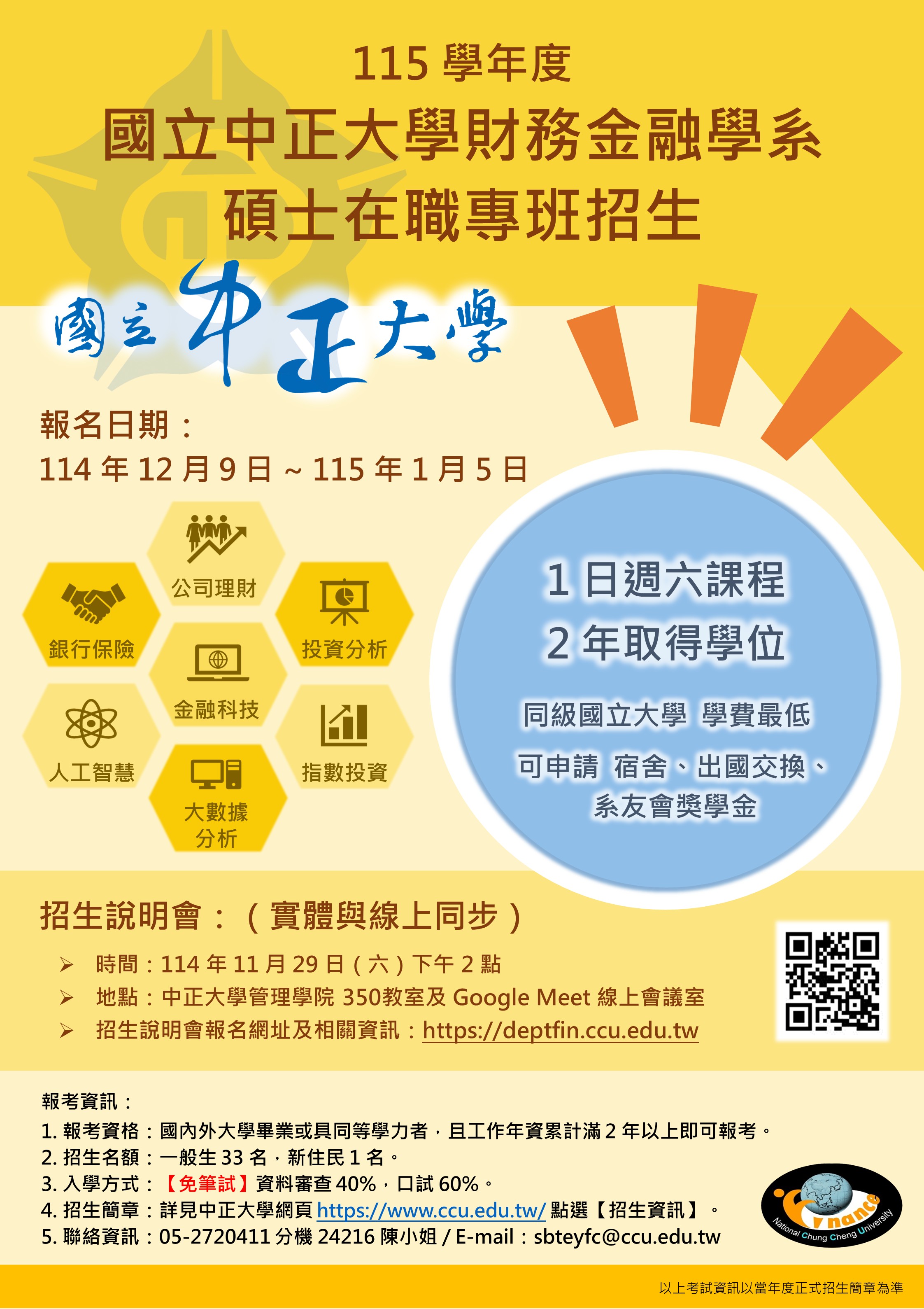 檢送國立中正大學財務金融學系碩士在職專班115學年度招生宣傳海報