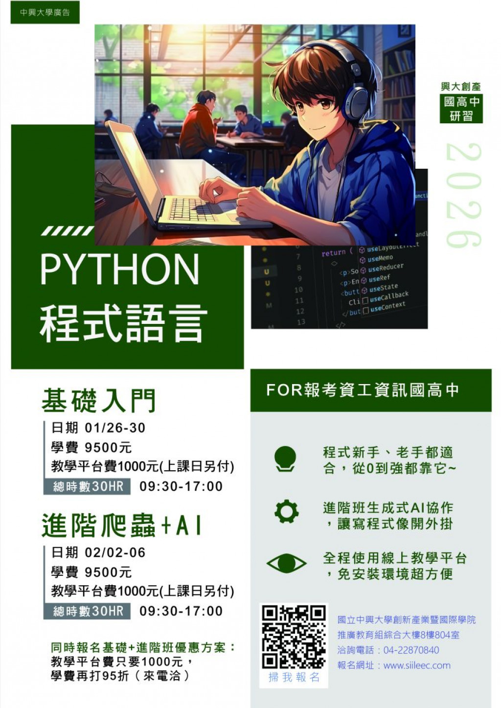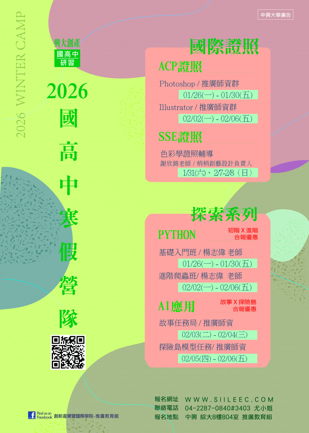 檢送本校2026年寒假Python程式設計系列、ACP與SSE色彩學國際證照輔導、AI應用故事 X 探索島系列招生海報與簡章,即日起開放報名,請惠予公告周知,並轉知貴校學生踴躍報名參加。 |