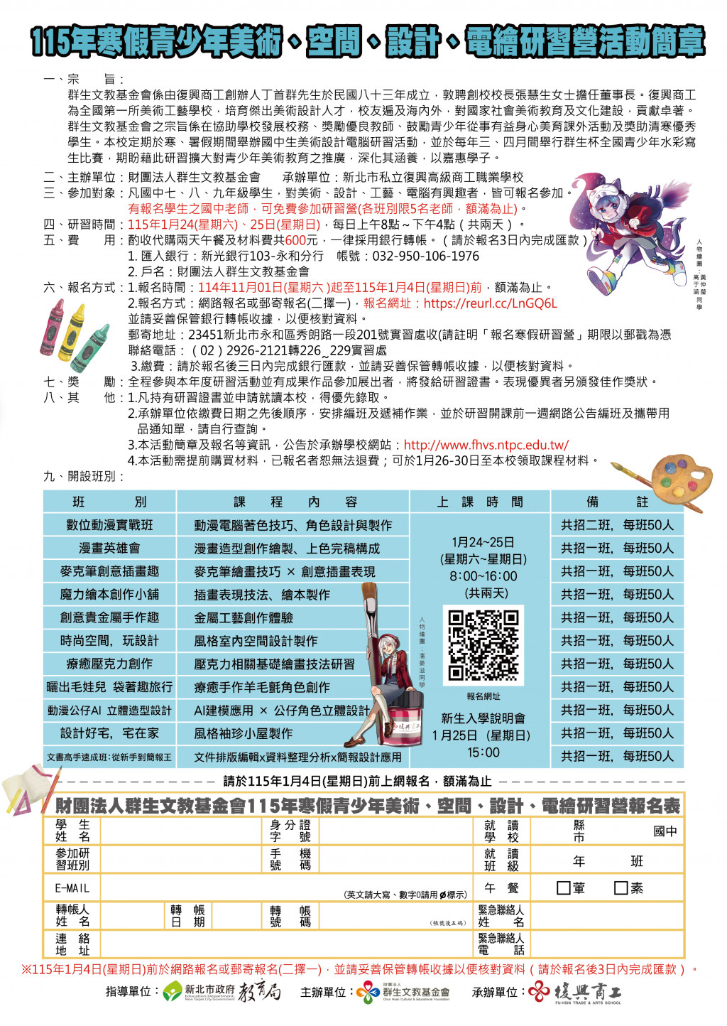 七、報名時間:114年11月01日(星期六)起至115年1月04日(星期日)前,額滿為止。 任何課程相關問題,聯絡電話(02)2926-2121轉226~229。