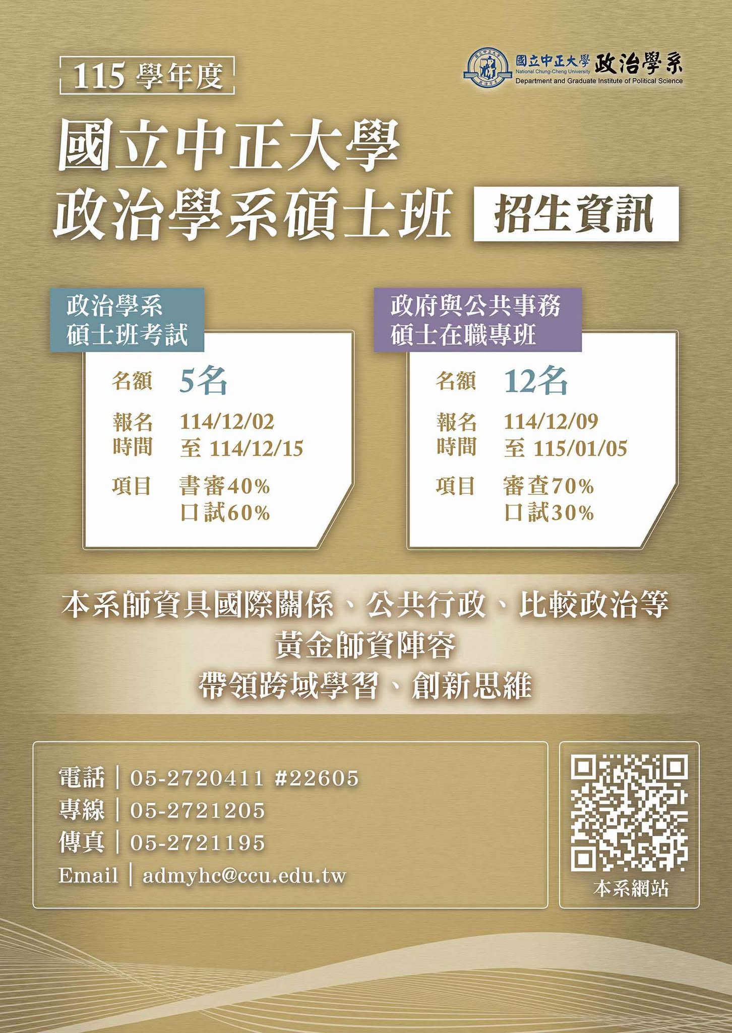 檢送國立中正大學政治學系115學年度政府與公共事務碩士在職專班招生考試資訊