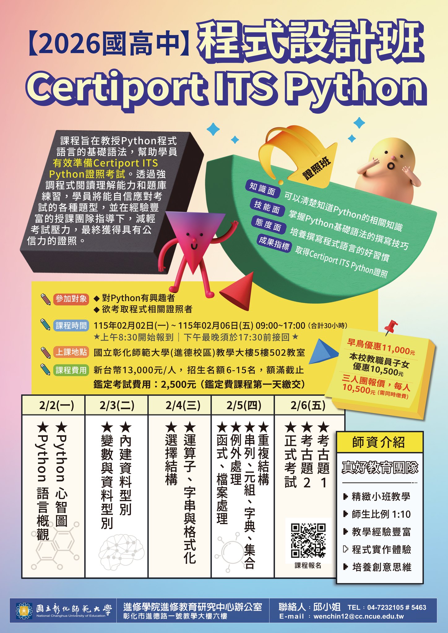 檢送國立彰化師範大學進修學院推廣教育「【2026國高中程式語言】Certiport ITS Python程式設計班」、「日語會話五十音基礎班」、「日語N3中級Ⅱ班」招生簡章