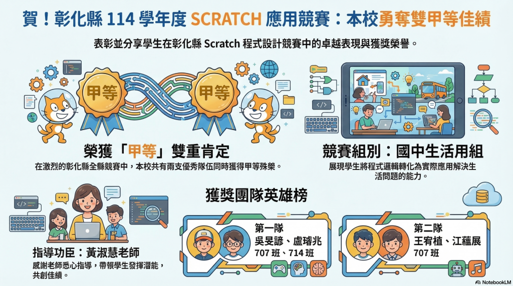 114學年度彰化縣國民中小學學生SCRATCH應用競賽榮獲國中生活用組甲等-兩隊