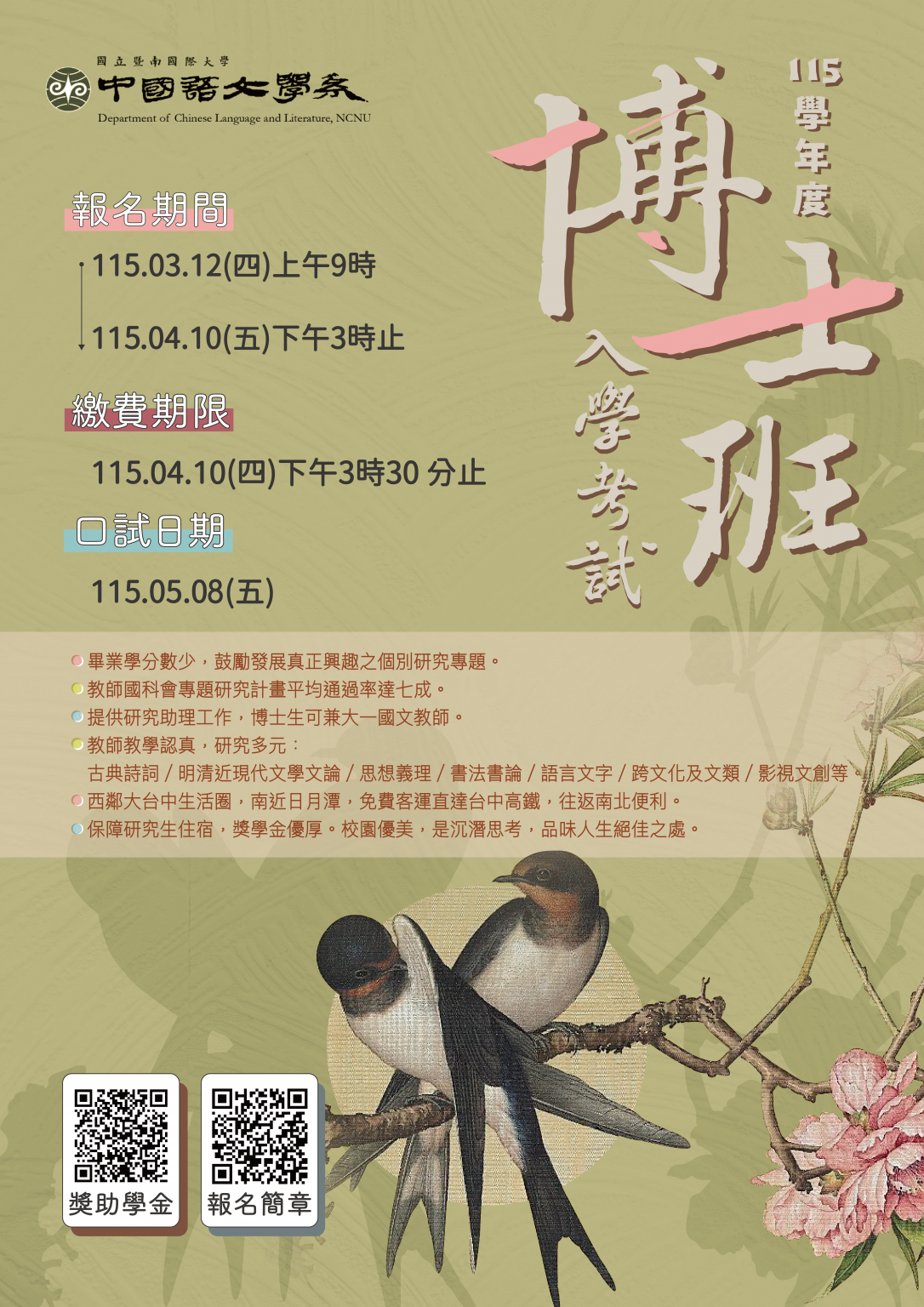 國立暨南國際大學中國語文學系115學年度博士班入學考試開始報名,檢送招生海報電子檔