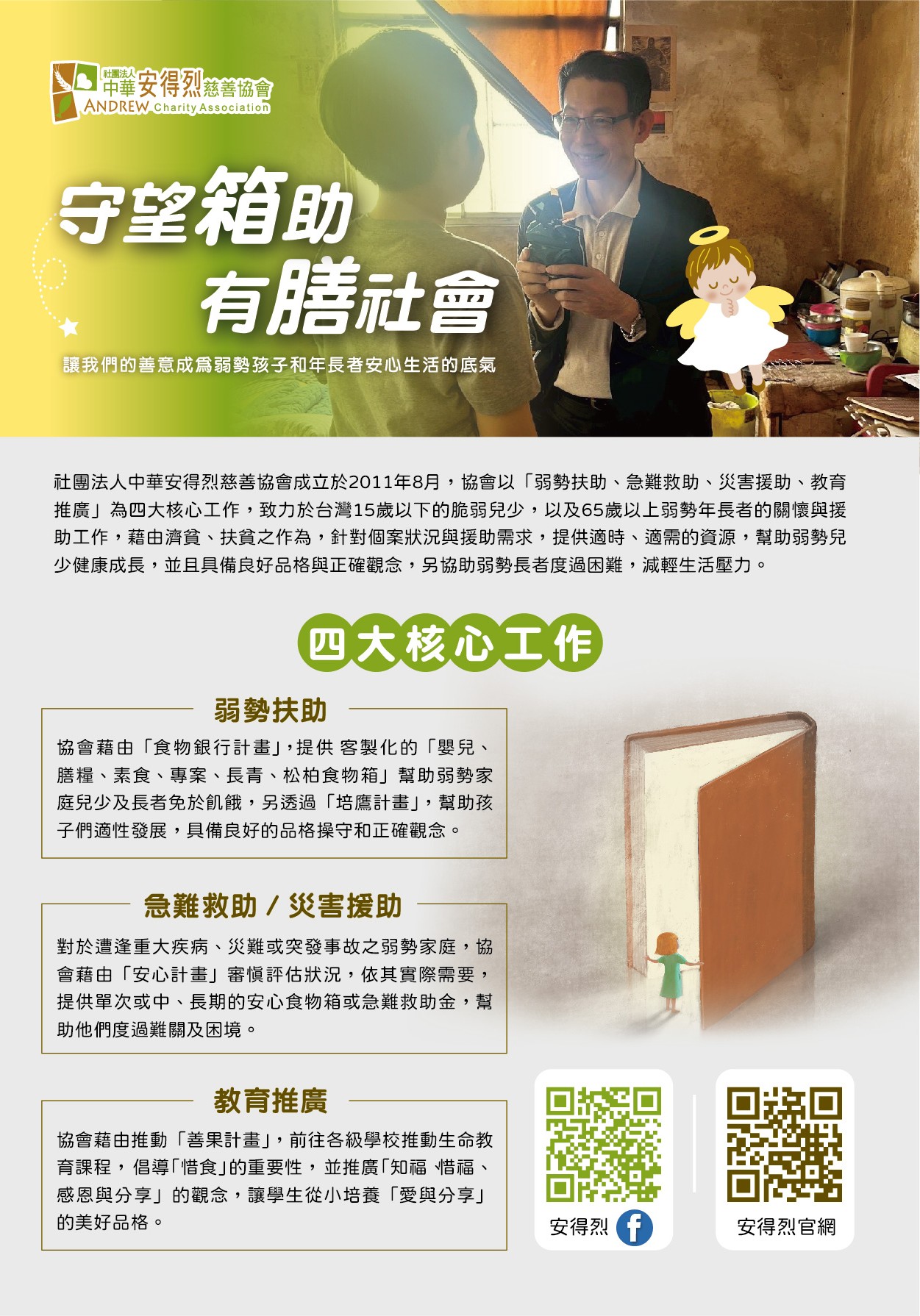 轉知:社團法人中華安得烈慈善協會為照顧弱勢家庭學子,擬按月提供「膳糧食物箱」一箱,符合資格學生,依限提出申請。