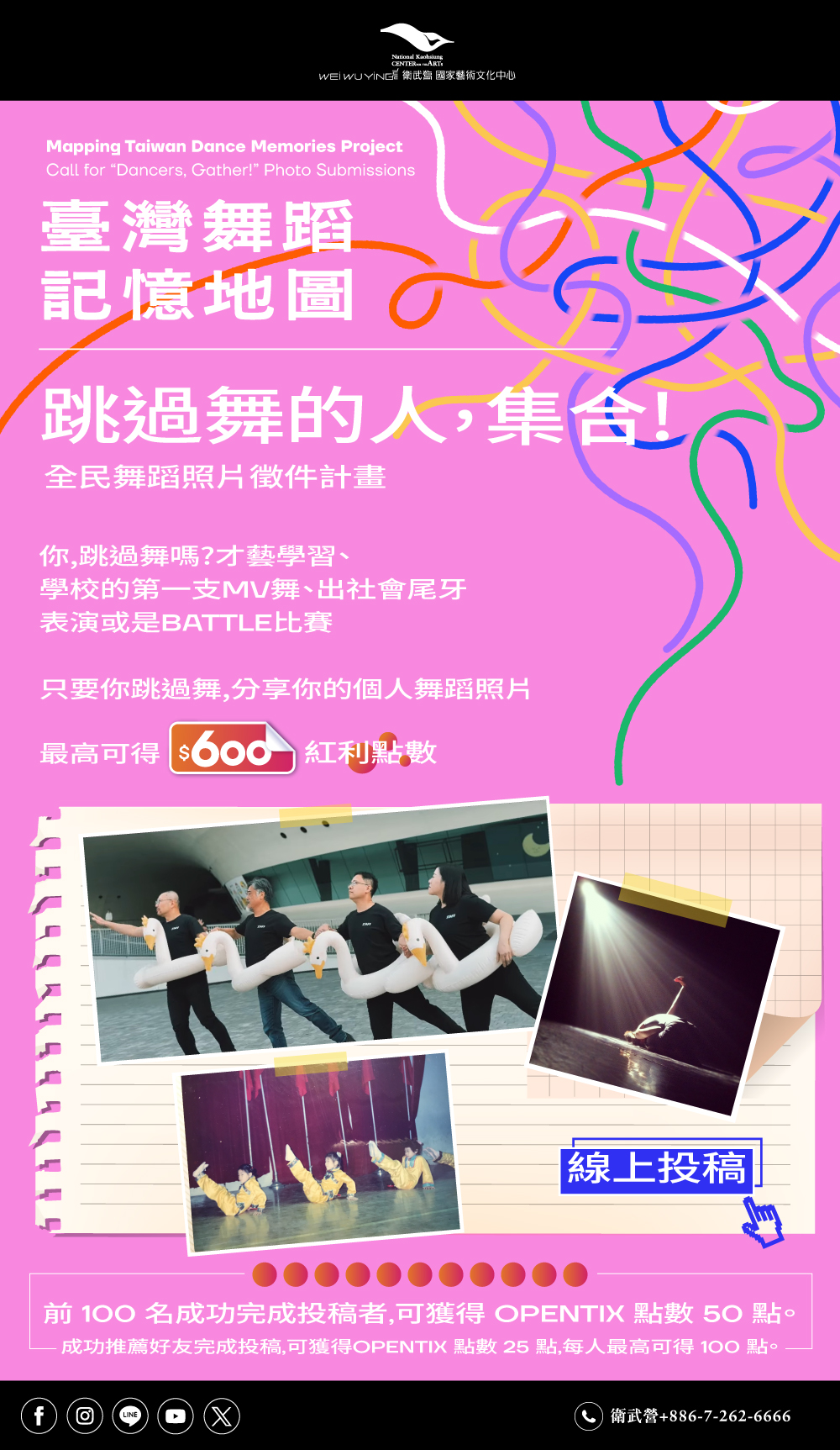 (二) 「跳過舞的人,集合!」全民舞蹈照片徵件活動參考簡章(附件二)或衛武營官網網址:https://npacwwy.tw/en08gMrIj,邀請師生共同參與投稿,擴大舞蹈記憶之蒐集與交流。