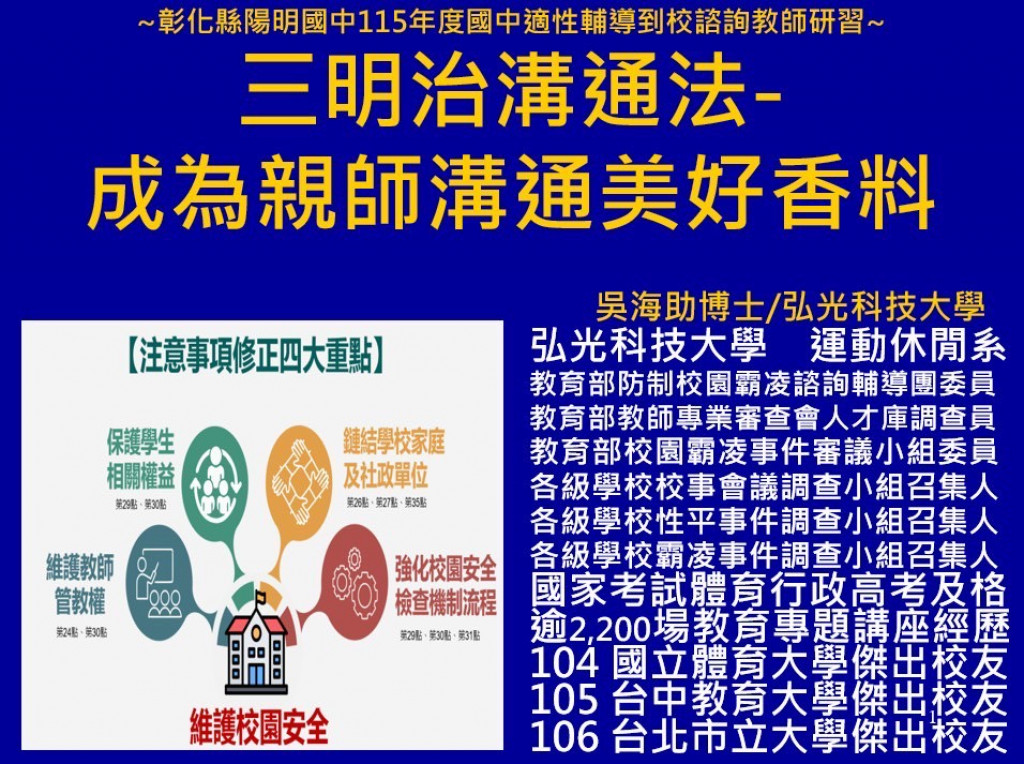 為增進教師親師溝通知能,並強化家庭教育議題融入課程之實務應用,本校辦理教師研習,相關資訊如下: